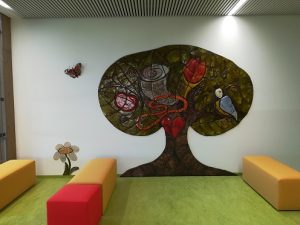 Wir versprechen, dass in diesem Haus eine Pädagogik des Herzens stattfindet. Diese kann nur auf einer breiten Basis gelingen: verwurzelt durch Fachkompetenz, geerdet durch die Persönlichkeit jeder einzelnen Mitarbeiterin, vor allem aber durch die Bereitschaft zur Annahme der Kinder in ihrem Sosein. Vielleicht fragen Sie sich was eine Tulpe, eine Spirale oder ein Band in einem Baum zu suchen haben: Individualität ist die Antwort!